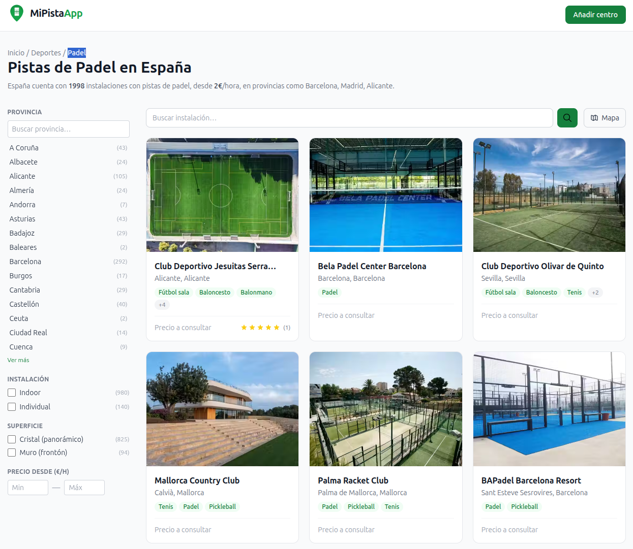 • Filtros específicos — pádel indoor, pádel individual, valoraciones, precio mínimo Cada ficha de centro incluye: